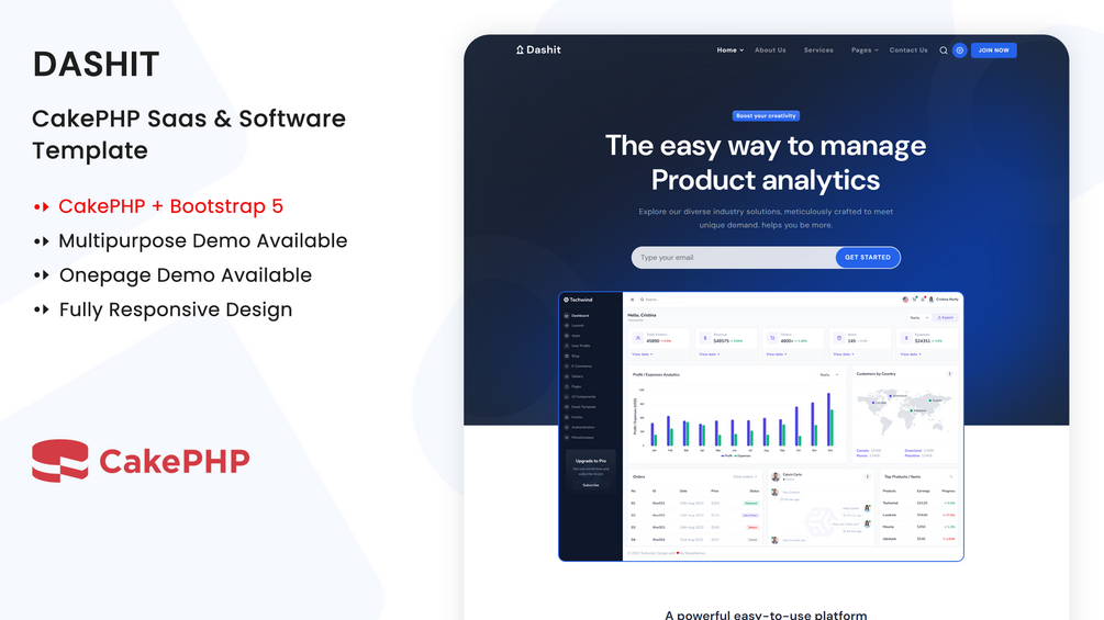 Dashit is a Powerful CakePHP Multipurpose Saas & Software Template. It is a multi-use and fully responsive template, specially designed for Software, SaaS, and Web App products. It is a fully responsive template built with CakePHP & Bootstrap 5. There are unique homepages with landing page variations. This design is straightforward to customize, and all files and code have been well organized and nicely commented for easy customization. It is 100% responsive and looks stunning on all screens and devices. Users will love your site because it gives them a unique user experience (UX), a clean, modern & beautiful design.