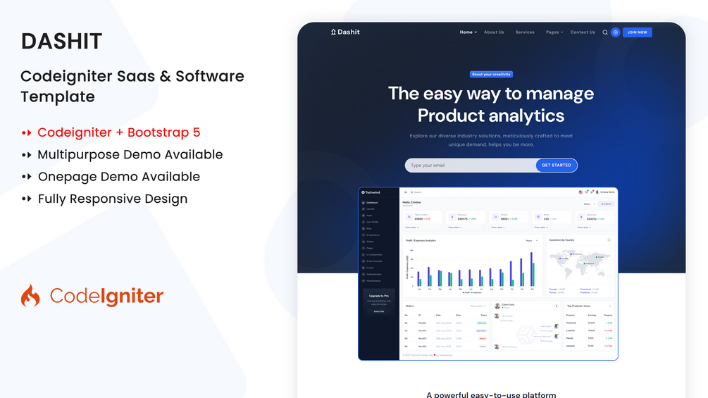 Dashit is a Powerful Codeigniter Multipurpose Saas & Software Template. It is a multi-use and fully responsive template, specially designed for Software, SaaS, and Web App products. It is a fully responsive template built with Codeigniter & Bootstrap 5. There are unique homepages with landing page variations. This design is straightforward to customize, and all files and code have been well organized and nicely commented for easy customization. It is 100% responsive and looks stunning on all screens and devices. Users will love your site because it gives them a unique user experience (UX), a clean, modern & beautiful design.