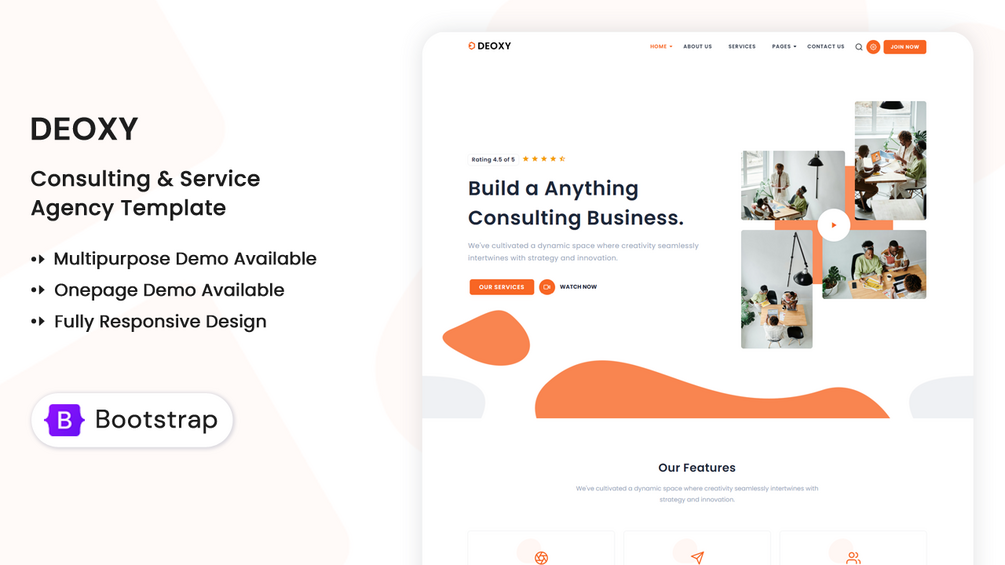 Deoxy is a Powerful Bootstrap 5 Consulting & Service Agency Template. It is a Fully Responsive Template suitable for any Digital Marketing, Agency, corporate, creative, or business startups. Multiple navigation styles are included in this template. A perfect template for Agency, Business, Corporate, Marketing, and Digital Marketing. The standard information sections will help anyone to customize according to their company info, add blogs, or work. Deoxy is built with the latest Bootstrap 5. It is 100% responsive and looks stunning on all types of screens and devices. Users will love your site because it gives them a unique user experience (UX), a clean, modern & beautiful design. They are also easy to customize and combine with other components.
