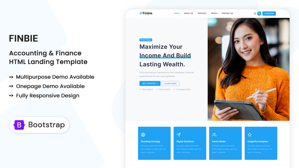 Finbie is a Multipurpose Accounting & Finance Template that is your premier choice for a Finance Consulting HTML template designed to meet the unique needs of various businesses and professionals, including accountants, advisors, finance attorneys, brokers, finance coaches, and corporate entities. Our template is meticulously crafted to provide the perfect online presence for finance-related businesses, ensuring a strong online presence in the competitive digital landscape. Finbie is based on the popular Bootstrap 5 Framework that allows flexibility and extendability. Take your yoga business to the next level with Finbie Accounting & Finance.