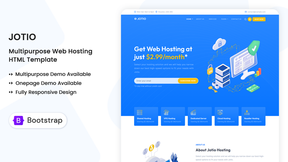 Jotio is a responsive, powerful, and passionately carved Multipurpose Hosting Template created especially for hosting, servers, cloud & business companies. The Jotio Template has everything that is required for a Hosting Company, like Cloud hosting, Web hosting, Reseller hosting or server, WordPress server, Email server, Shared Hosting, VPS hosting, Dedicated Hosting, and many more useful inner pages. It is a fully responsive template based on Bootstrap 5. It looks perfect on all major browsers, tablets, and mobile devices. All files are organized, and we believe it will be easy to use and edit them. This template is well-organized and very easy to customize.