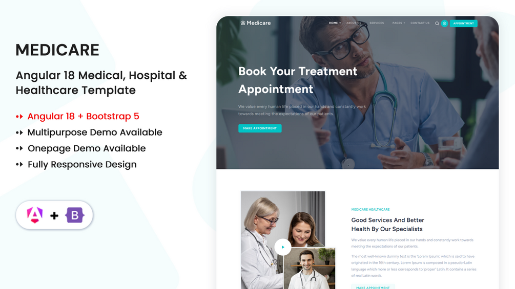 Medicare is a Powerful Multipurpose Medical, Hospital, and Healthcare Template. This can be used for any health-related website such as doctors’ clinics, hospitals, doctor consultation centers, cosmetic surgery centers, medical laboratories, dental clinics, centenary clinics, pharmacies, etc. It is a fully responsive template based on Angular & Bootstrap 5. Fully responsive design layouts with visitor-centric stunning look and feel will help reach the business’s target audience.