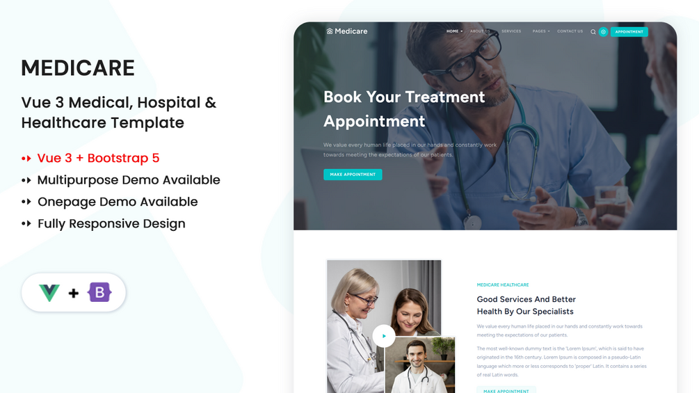Medicare is a Powerful Multipurpose Medical, Hospital, and Healthcare Template. This can be used for any health-related website such as doctors’ clinics, hospitals, doctor consultation centers, cosmetic surgery centers, medical laboratories, dental clinics, centenary clinics, pharmacies, etc. It is a fully responsive template based on Vue js & Bootstrap 5. Fully responsive design layouts with visitor-centric stunning look and feel will help reach the business’s target audience.