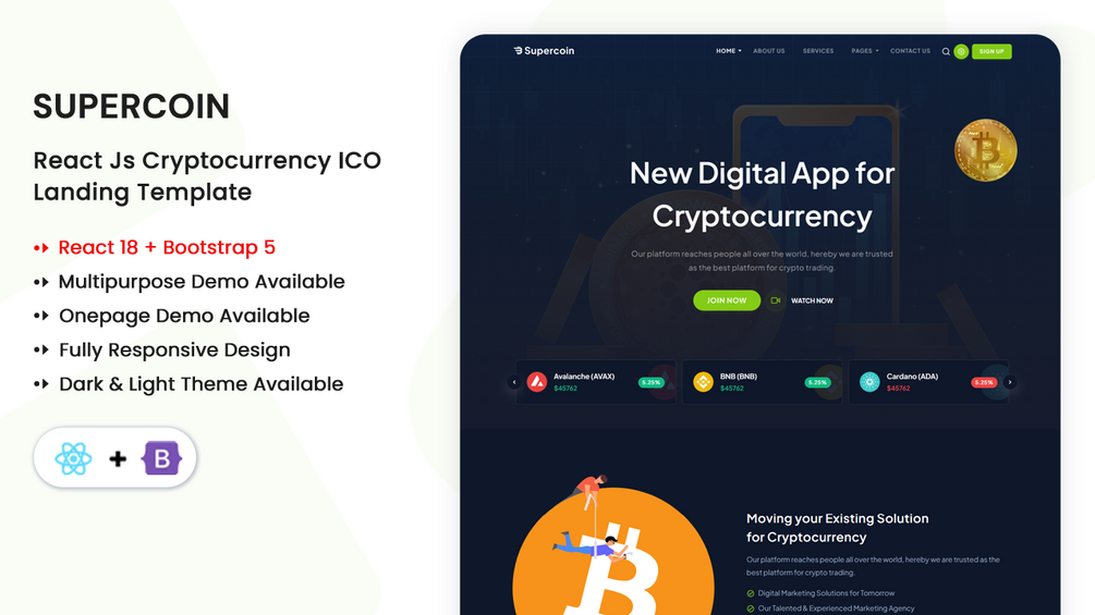 Supercoin is a Powerful Multipurpose Cryptocurrency ICO Landing Template. Supercoin is a fully responsive, super flexible, powerful, clean, and complete solution for your Cryptocurrency ICO start-up agency. If you are working with any type of Digital Cryptocurrency business, NFT Marketplace, Blockchain Consulting, or Development Firm for every industry, then Supercoin is the best Cryptocurrency ICO Template to launch your website. It is 100% responsive and looks stunning on all types of screens and devices. It is a fully responsive template based on React JS & Bootstrap 5. Users will love your site because it gives them a unique user experience (UX), and a clean, modern & beautiful design.